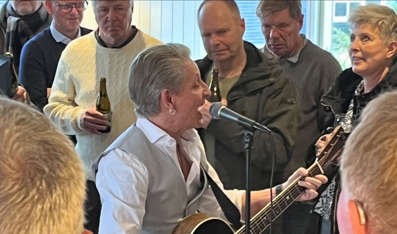 Efter at have nydt både kunstudstilling og det lækre måltid, samledes alle om rundbordene i det hyggelige forsamlingshus. Her blev gæsterne mødt af Henrik Volf selv, der denne gang bevægede sig fra kunsten over til musikken.